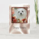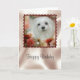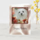Esta tarjeta de cumpleaños incluye un retrato de Snowdrop, un pequeño perro maltés dulce con hermosas flores de foco suave y un elegante marco de vieiras.