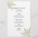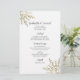 Personalizar el elegante Snowflake de Oro en el menú de la Boda Blanca de Invierno con los detalles de la comida que se sirven en el almuerzo de la ducha de novias de diciembre, enero o febrero, la cena de la recepción matrimonial o el brunch post boda añadiendo la ensalada o primer plato, entrante o segundo y postre o tercer curso. Personalízalo con los nombres de la novia y el novio, la ubicación del lugar y la fecha del evento. Este elegante menú personalizado boda en invierno se caracteriza por sus intrincados copos de nieve dorados que adornan las esquinas con un fondo blanco.
