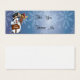 Cartel de personalizable con un muñeco de nieve con sombrero de punta y un reno adorable con un sombrero de Santa, contra un fondo azul de copo de nieve