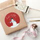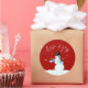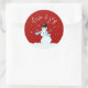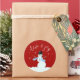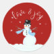 Navidades "Amor y alegría" sellos para sobres con feliz ilustracion de hombre de nieve. Rojo con texto blanco que se curva sobre el muñeco de nieve que usa una bufanda azul y sombrero de la parte superior negra. Los pegatinas vienen en dos tamaños.