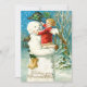Este muñeco de nieve y sus amigos se están divirtiendo mucho. Esta imagen vintage de Navidad muestra a un muñeco de nieve jugando con un cherub. Tiene cuatro cuchillas en su gorra.