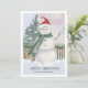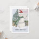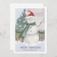La escena de cartas de los Navidades tradicionales incluye un muñeco de nieve de color agua con sombrero de Santa y bufanda verde. Pinos, leña y una valla de piquetes completan el escenario vacacional. Más abajo se escribe Feliz Navidad en un elegante tipo de letra en serif. Una segunda línea de texto personalizado le permite agregar su nombre u otro sentimiento.