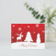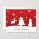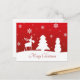 Moderno y minimalista ilustracion de Navidades simples con siluetas blancas de reno, árbol, muñeco de nieve y copos de nieve con Feliz Navidad con fondo rojo.