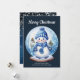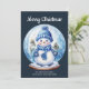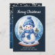 "Feliz Navidad" Navidades de personalizable saludando a una tarjeta con un lindo muñeco de nieve dentro de un globo de nieve en un fondo azul marino. Personalice el nombre de su familia y cualquier otro texto que elija.