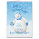 Pequeño y lindo muñeco de nieve con gorra de invierno azul y mitones a medida que delicadas copas de nieve caen por el cielo azul es un diseño de Navidades deliciosos para saludar a tu especial madre. También puedes disfrutar de sellos y regalos a juego disponibles en mi tienda. Arte original y diseño de Anura Design Studio.