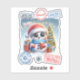 Un pegatina encantador exhibe a un animado muñeco de nieve con un gorra acogedor, tomando una bebida caliente. A su alrededor hay regalos coloridos y un árbol de Navidad bellamente decorado. Los sellos festivos añaden encanto, destacando la magia de la temporada de vacaciones.