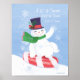 Un feliz hombre de nieve se sienta sobre un disco de menta de menta mientras se desliza por una colina nevada. Ilustracion original de Noël Snow.