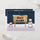 Ilustracion gráfico de invierno con dos lindos muñecos de nieve sosteniendo un cartel de madera en un ambiente nevado.