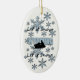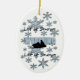 Diseño gráfico de copos de nieve y moto de nieve del artista/diseñador Charmaine Paulson en un adorno navideño. El ornamento tiene el texto "Let it Snow Wyoming", y plantillas para su personalización.