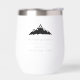 Estos tumblers de moda invernal hacen grandes regalos de fiesta nupcial o favores de boda de destino para su boda de invierno o boda de la estación de esquí. El diseño minimalista limpio incluye los n nombres, la fecha de boda y la ubicación en las letras clásicas del serif negro. Un nevado ilustracion de montaña en negro completa el diseño.