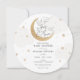 Invitación de Baby Shower con nubes y estrellas de color gris acuático con luna purpurinoso dorada y guión divertido "¡Estamos de luna!" Personalice su información o haga clic en "hacer clic en el personalizar más adelante" para ajustar el tipo de letra, el tamaño y el color.