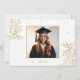 Esta es una elegante invitación de graduación con un diseño floral dorado con acentos delicados y un sofisticado tipo de letra de guión. El diseño incluye texto de personalizable para el nombre del graduado y una foto en la parte posterior. Un pequeño ilustracion con gorro de graduación le da un toque de celebración. Perfecto para celebraciones de graduación formales y elegantes.