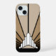 Un clásico estilo Art Déco patrón solar en el bronceado. Un patrón icónico del sol saliendo por detrás de un estilizado edificio de estilo Art Déco. Un diseño sencillo pero elegante, fiel a la época.