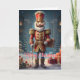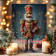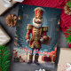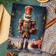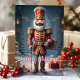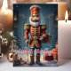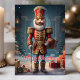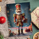 Celebra la temporada navideña con esta elegante tarjeta que presenta a un clásico soldado cascanueces rodeado de regalos festivos. El mensaje de "Feliz Navidad" añade un toque atemporal, perfecto para enviar saludos navideños alegres a amigos y familiares que aman la decoración tradicional de Navidad.