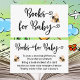 Comparte la alegría y las maravillas del libro con Baby. Estilo de tipografía simple Books For Baby para incluir tu invitación a la ducha. Pida a los clientes que compartan un libro inscrito con su nombre para crear un tesoro conservador. Moderno blanco y negro con escritura elegante que incluye corazones de amor. Incluye hermosas abejas de burbujas acuáticas.