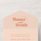 Una invitación nupcial con tipografía retro naranja es una elección elegante y única para una ocasión especial. Las letras naranjas brillantes y audaces destacan sobre el fondo de la melocotón claro, creando un sorprendente contraste visual. La invitación se ve reforzada por la adición de detalles de diseño de sol y flores, que le dan un toque de brillo y alegría al diseño general. El sol y las flores le dan un ambiente alegre y alegre a la invitación, lo que lo hace perfecto para una celebración boda divertida y memorable.