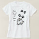 Cuatro huellas de pata de gato negro están en un lado de esta camisa, con el texto negro en el otro que dice "Sólo mi gato camina por encima de mí". Debajo de las huellas de la pata del gato hay una imagen personalizado de un gato feliz con una corona. ¡Qué lindo!