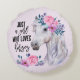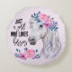 Bonito rosa, almohada redonda con un caballo, flores y la frase "Sólo un Chica que ama a los caballos"