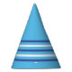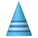 Tonos de gorra fiesta azul con rayas azules y blancas en el fondo de un huevo azul de un ladrón para el cumpleaños de un niño pequeño o una ducha de bebé de un recién nacido. Simple y lindo gorra fiesta de conos de papel azul.