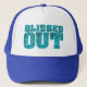 Nuestro Sombrero Camionero Blissed Out tiene un efecto azul falso piel de serpiente "bling" y letras atléticas atléticas atléticas audaces. Diseñado para almas espirituales que conocen la alegría de una vida abierta. Se muestra en una tapa real y blanca, disponible en una variedad de colores.
