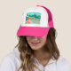 Este diseño de Sombrero de Camionero Fiesta de la Piscina Retro Gay presenta cuatro tortitas hambrientas que tienen un tiempo gay mientras superan el calor de Palm Springs relajándose alrededor del agua azul turquesa de su piscina atómica en forma de boomerang. La arquitectura moderna de mediados de siglo, en la fabulosa casa de piedra naranja, es claramente un establecimiento de primera categoría, dadas las vistas a las montañas en segundo plano. Un sol estelar amarillo brilla con fuerza en el cielo turquesa para que puedas ver todos los detalles encantadores, desde los flamencos rosados y kitschy hasta la cerca de bloques de rayas y brisas de los años 50. Y por supuesto, ¿qué mansión de Palm Springs estaría completa sin una palmera?