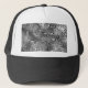 Sombrero de camionero con un diseño abstracto "líquido metalizado" y formas giratorias, burbujeantes en tonos de gris plateado. Se puede usar como fondo para tu propio texto, imágenes e ideas. Tenga en cuenta que esta es una imagen de arte digital impresa, no brilla ni contiene metalizado real.