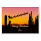 Una tarjeta de Navidades para tu hijo mostrando a Santa volando sobre el desierto. Se ven muchos cactus altos en silueta. Desee una feliz Navidad desde el desierto con una hermosa tarjeta de color puesta de sol.