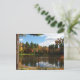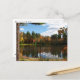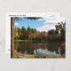 Esta preciosa postal cuenta con una joven sentada y soñando en el muelle al borde de un gran estanque. El otoño está en el aire. El agua está rodeada de árboles con magníficos colores otoñales amarillos, verdes, rojos, naranjas y dorados. El cielo azul tiene nubes blancas onduladas y todo esto se refleja en el agua. El tronco de un gran pino define el lado izquierdo. El brillante sol se refleja en su cabello rojo.