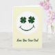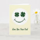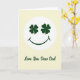 Esta tarjeta muestra una cara sonriente estilizada centrada cerca de la parte superior, con dos tréboles de cuatro hojas que sirven como sus ojos en un verde esmeralda profundo ☘️. La cara está dentro de un círculo blanco brillante que se destaca sobre un fondo suave y amarillo pálido, lo que da a toda la escena un aspecto suave y soleado. Esos “ojos” de trébol se sienten como una mirada amistosa, como si la sonrisa estuviera mirando con cariño a alguien que le importa 💚. Debajo del círculo, las palabras “Te amo, querido papá” están escritas en un estilo cursivo fluido, colocadas en la mitad inferior del diseño. La letra aparece en un tono verde oscuro que coincide con los tréboles, lo que une el texto de manera ordenada con la imagen principal. Con mucho espacio abierto y formas simples, el diseño mantiene la atención en la cara sonriente y el mensaje debajo. El círculo blanco tiene bord
