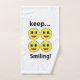 Sonrisa Cara sonriente Sigue Sonriente Sonrisa Sonrisa Toalla de mano original de Nisha Prabhu. Relájese con nuestra deliciosa toalla de mano "Sonriente sonriente cara sigue sonriente". Esta toalla, diseñada para darle alegría a la cocina o al baño, tiene una cara sonriente adorable que irradia positividad. Perfecto para el uso diario o para el regalo, esta toalla es un recordatorio para acoger cada momento con una sonrisa. ¡Colóquelo, úsalo y siéntase inspirado para seguir sonriendo todos los días! ¡Consigue el tuyo ahora y deja que fluyan las buenas vibraciones!