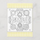 Tipografía inspiradora "Sonreír" para que los niños se coloreen. Ideas útiles - Úsalo como actividad de entretenimiento en fiestas, favores de fiesta, actividades escolares de domingo, correo a amigos, correo a abuelos de nietos, o como alegre arte en la pared o en el frigorífico. Ideal para niños, estudiantes jóvenes, profesores y padres. Pequeñas flores con caras de sonrisa en diseño. El fondo es un patrón de argyle amarillo.