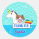 Estos pegatinas cuentan con un ilustracion de Sophie, un personaje de dibujos animados de perro, relajándose en su flotador inflable de piscina en forma de unicornio arcoiris. Sophie es un perro blanco y marrón que lleva puesto un traje de baño de piña. El pegatina tiene un diseño de líneas onduladas y acento brillante. "Gracias" está en un tipo de letra en forma de globo, y la parte de la firma del nombre es de color rosa. Personalizar a estos pegatinas con su propio mensaje y nombre. Esto sería genial para decorar las bolsas de regalo, regalar como favores de fiesta o como un toque especial para vestir tarjetas de agradecimiento.