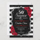Sorpresa Invitación a los 50 Años. Diseño rojo, blanco y negro femenino con una falsa plata purpurina. Presenta rayas negras y blancas, rosas rojas, fuente de escritura y confeti. Perfecto para una elegante fiesta de cumpleaños. Se puede personalizar para mostrar cualquier edad. Mándame un mensaje si necesitas más personalización.