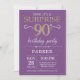 Sorpresa 90 cumpleaños invitación con fondo morado y Purpurina de oro.Pizarra. Cumpleaños de adultos. Invitar el cumpleaños de hombres o mujeres. Cualquier edad.