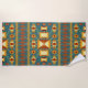 Toalla de playa con rayas doradas del suroeste del Sol dorado con una imagen de diseño artístico de TheFabricSeal en Zazzle. Elegantemente diseñado y colorido con vibrante naranja dorado, rojo indio, crema dorada, azul turquesa y verde más colores marrón color tierra. El arte tribal espiritual del suroeste de los indios influyó en los diseños de estilo para mantas, alfombras y alfombras.