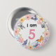 Una insignia de alfiler de bonito con las palabras "Soy 5" rodeadas por un borde de flores y mariposas. El bonito botón es blanco, con un número cinco rosado y un borde floral de color pastel. Un adorable accesorio para un cumpleaños.