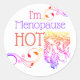 ¡Estoy menopausia caliente! Muéstrales a tus damas del lado de los embutidos. Este diseño presenta un alphonse・woman, enmarcado con pergamino victoriano. Dice "Estoy menopausia caliente". En colores suaves de rosa caliente, morado, rojo y amarillo.