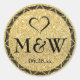 El purpurina de oro falso redondo y el monograma negro favorecen a los pegatinas. Corazón negro abierto con iniciales monogramadas de novia y novio más la fecha de su matrimonio. Pegatinas de agradecimiento personalizados o sellos o pegatinas de lujo. Tipografía elegante y moda de borde negro y dorado con toques de estilo Art Deco. Los brillantes brillantes purpurinas dorados crean una atmósfera de lujo. Perfecto para un boda de Art Deco, boda Gatsby, boda de Abadía del Centro de la Ciudad, boda boda, antigua o vintage de los años 20.