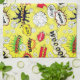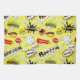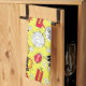 Toalla de cocina divertida con imágenes de salpicaduras, bam, boom, choque arreglado en un patrón contra un fondo amarillo.