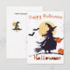 The image features a purple-toned silhouette of a witch walking across a dark landscape. She is wearing a classic pointed hat with an orange band and is carrying a glowing Jack-o'-lantern. Another carved pumpkin sits on the ground beside her. Behind the witch, a large, pale yellow full moon illuminates the scene, highlighting her profile and long, flowing hair. Small bats and stars are scattered in the night sky. The text "Happy Halloween" is written in a playful, orange script at the top, with a larger "Halloween" at the bottom.