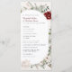 Añada un toque elegante a su boda de invierno con este programa de bodas de diseño impresionante, que forma parte de la colección Spruce & Lace. Con una sofisticada combinación de flores de acuarela, entre las que se incluyen los verdes eucaliptos suaves, las románticas rosas rojas profundas y los delicados acentos onantes, este programa complementa perfectamente su tema de bodas de invierno sin elementos nevados tradicionales. El diseño ofrece un toque elegante y moderno, al mismo tiempo que mantiene un ambiente clásico. Con un diseño limpio y un texto de personalizable, usted puede personalizar cada detalle de su ceremonia de boda, desde el orden de los eventos hasta reconocimientos especiales. Perfecto para las parejas que buscan un aspecto refinado y caprichoso para su boda de invierno o primavera temprana, este programa es a la vez elegante y funcional, ofreciendo a los huéspedes un gran placer para recordar su día especial. Ya sea que esté planeando un boda rústico en el campo o una celebración formal, la colección Spruce & Lace es la elección perfecta para celebrar su historia de amor con estilo. Características principales: Elegantes flores de color agua en Personalizable rojo, negro y verde para todos sus detalles de la ceremonia Impresa en papel premium para un acabado de alta calidad Parte de la suite de papelería boda Spruce & Lace Ideal para bodas de invierno, temas de inspiración natural y eventos rústicos Crea una impresión duradera en sus invitados con este programa de bodas diseñado cuidadosamente que refleja la belleza y calidez de su celebración de invierno. Agregue la redacción de su personalizado a este diseño utilizando los cuadros "Editar esta plantilla de diseño" situados en la parte derecha del elemento, o haga clic en el botón azul "Personalizar" para organizar el texto, cambiar los tipos de letra y los colores y añadir información o imágenes adicionales a este diseño. Haga clic en "Personalizar adicional" para abrir opciones completas de edición. Si necesita algún elemento de coordinación, (gracias a las tarjetas, etc.) por favor contáctame para un pedido de personalizado. **** Para las solicitudes de personalizado con las que necesita mi ayuda, no coloque esta mercancía en su carrito. En su lugar, envíeme su solicitud por correo electrónico a lauralise@iyhtvdesigns.com Una vez que el artículo esté disponible, se le enviará por correo electrónico un enlace a su mercancía. Puede usar ese enlace para realizar su pedido. Por favor, espere hasta 48 horas.