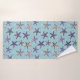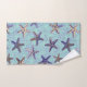 Starfish en la arena con toalla de baño coralize. Pescado estelar colorido de color morado, rosa, gris y marrón sobre un fondo verde azulado azul y violeta texturado. El conjunto se acentúa con el Coralize, coral en tonos violetas. Océano, mar, decoración de baño inspirada en la casa de playa náutica.