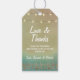 Boda Tropical Starfish +Seashell Gracias Etiquetas - Puedes cambiar la redacción y usarlas para cenas de ensayo, duchas de novias y más. Luces de cuerda, conchas de oro impresas y peces de estrella con un bonito fondo de playa en tonos azules, verdes, tostados y otros colores. Vea la colección completa de coincidencias que aparece a continuación en este diseño.