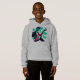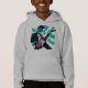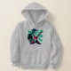Un esqueleto robótico con un mohawk azul estilo punk toca una guitarra eléctrica rosa brillante que emite ondas de energía eléctrica cuando se toca. el robot usa una chaqueta de cuero negro.