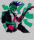 Un esqueleto robótico con un mohawk azul estilo punk toca una guitarra eléctrica rosa brillante que emite ondas de energía eléctrica cuando se toca. el robot usa una chaqueta de cuero negro.