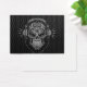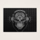 Un elaborado diseño de cráneo de azúcar DJ decorado con complejos remolinos y patrones de puntos. Los audífonos se sientan encima del cráneo con dos cables colgando debajo. Las líneas y círculos complejos son de color negro sólido, mientras que el interior del cráneo está acabado con texturas de acero inoxidable y colores plateados. El cráneo se sienta sobre un fondo de malla de acero que completa este patrón industrial. Esta imagen inspirada en el Día de los Muertos es una representación colorida de la cultura DJ.