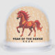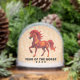 Welcome the Chinese New Year on February 17, 2026, with this snow globe, which features the stunning design of a fiery red horse with flame-like mane, tail, and flame motifs, with the Chinese letterforms for "Happy New Year" in the background. Text can be personalized. Reverse shows identical design.