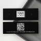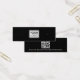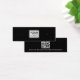Tarjeta de visualización de mini producto de joyería de color negro con personalizado central y código QR en la parte posterior. Se pueden ajustar las guías de asignación agregando y eliminando espacios en el campo de plantilla y moviendo todo el elemento en la herramienta de diseño.