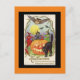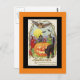 Imagen vintage de un gato negro y brujas alrededor de una calabaza con un búho y murciélagos por encima. Incluye un saludo encantador.