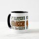 Gran regalo para los hombres y las mujeres del aire libre que ofrecen una cabina en las maderas con un rifle y trole afuera. Los habitantes de la cabina en las ventanas están teniendo un fiesta y están mostrando apagado su captura grande de pescados. El texto dice QUÉ SUCEDE EN LAS ESTANCIAS de la CABINA EN LA CABINA. Final y fondo de madera de grano en los regalos seleccionados. ¡En las camisetas, las tazas, las bolsas de asas, los posters, las cubiertas del iPad y más! ¡Original de PinkInkArt!
